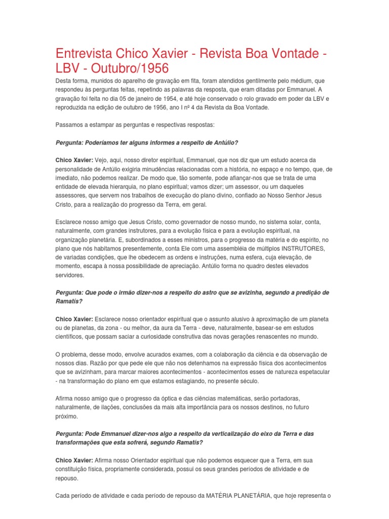 Selecionamos nesse artigo, respostas do médium espírita, chico xavier, em algumas das suas entrevistas e depoimentos para tvs, jornais e revistas em nosso país e que estão publicadas no livro chico xavier, entrevistas. Selecionamos nesse artigo, respostas do médium espírita, chico xavier, em algumas das suas entrevistas e depoimentos para tvs, jornais e revistas em nosso país e que estão publicadas no livro chico xavier, entrevistas. Postado por cira às 18:29. Por que razão os sites me pedem um login?