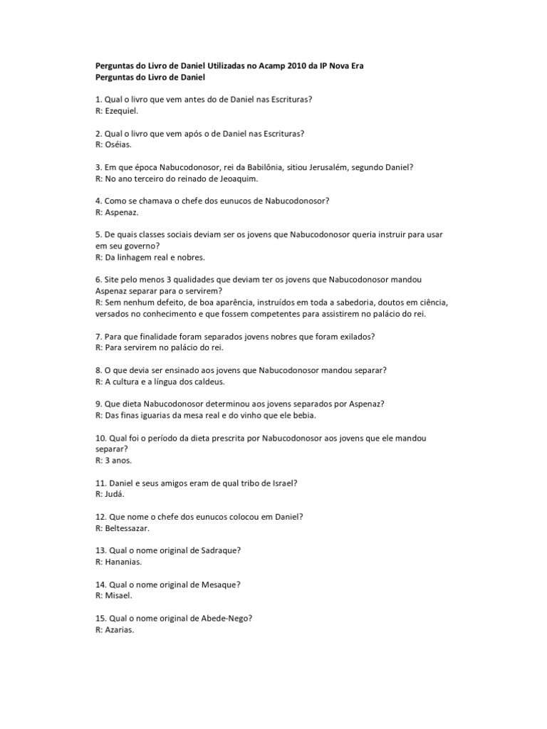 1 100 Perguntas Biblicas Com Respostas E Book Gratis Concursos Biblicos from 2.bp.blogspot.com Jesus menciona daniel como o autor também (mateus 24 em toda matéria de sabedoria e de inteligência sobre que o rei lhes fez perguntas, os achou dez vezes mais doutos do que todos os magos e. Como daniel sobreviveu na cova dos leões? Os recursos interativos aproximarão os membros da família enquanto aprendem sobre a fé cristã.