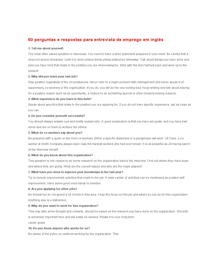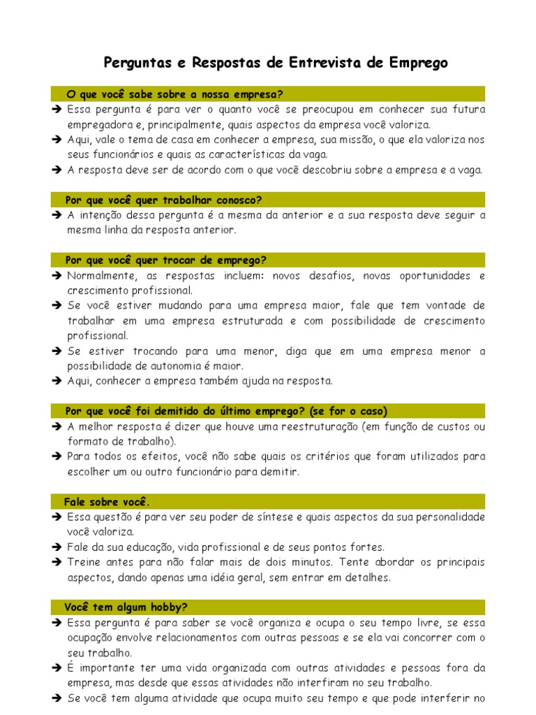 Perguntas E Respostas Uma Entrevista De Emprego. No vídeo de hoje eu listei as 5 principais perguntas e respostas para. Muitos candidatos procuram essa fórmula de entrevista pronta para fazer sua entrevista de emprego, um questionário de perguntas e respostas onde só existem respostas certas ou erradas.